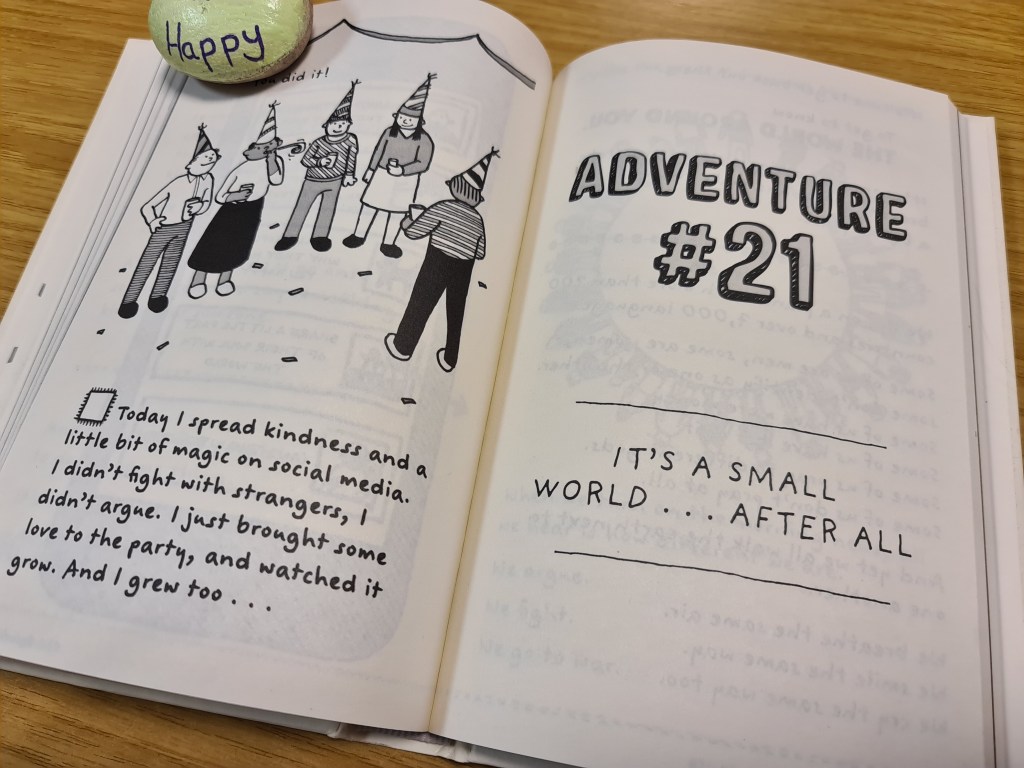 Pages like the one above are made for cutting out and giving away: I’m so unable to ruin books, usually, so I can see I’ll have to find a different way of doing the task that day. There are 28 actions (the 1/2 is to write to the author) so I’m thinking between now and September I’ll have a go at doing as many as I can and spread some peri-covid happiness!!! (peri-covid here meaning during covid)