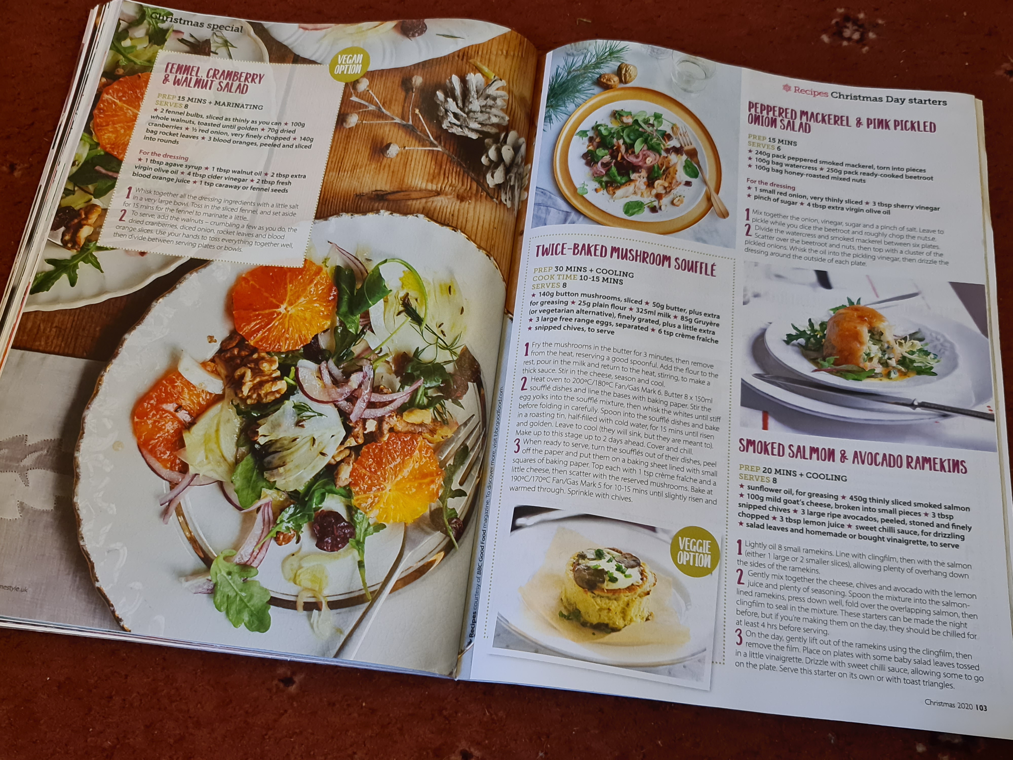 All three have the same or similar constituent elements: advice on planning ahead for Christmas, some present ideas, decorating hints and tips and cookery sections that, as well as the obvious advice on cooking for Christmas Day dinner, include either Christmas Eve, Boxing Day or New Year’s Eve cooking. No one magazine includes all three, since each chooses their own area of interest. They all have a good range of baking recipes and ideas.