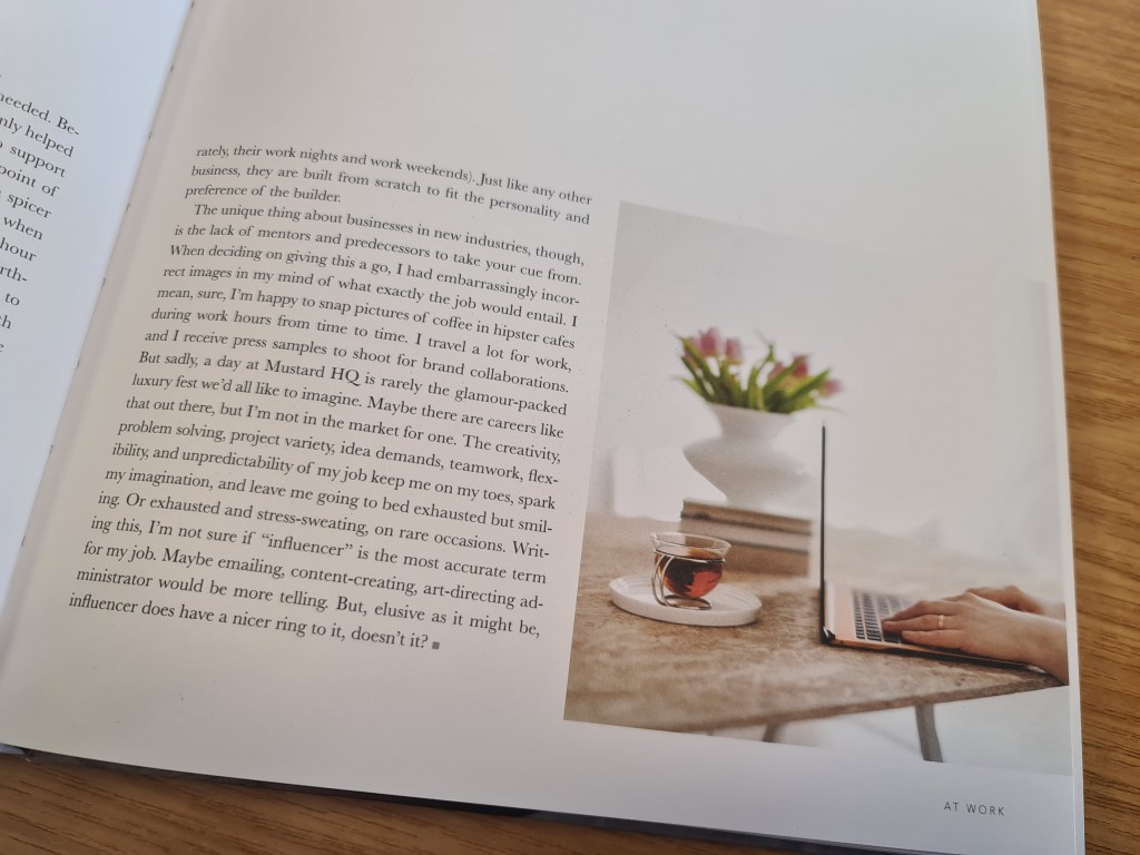 The book is divided into seven sections: At Home; At Work; On the Table; On Your Body; In the Suitcase; On Your Mind; and In Your Company. Jenny writes about her life and experiences, and each section is a collection, I think, of some blog posts from her website and some new content. The writing is eclectic: some posts are like lists of things or ideas to do, others like small essays on travel, home or work. Jenny tells her life story without chronological direction, and gets her own personal point of view over very well. For example… in her post ‘Social Media: A Defense (sic)’, she writes that sharing on Instagram “was about enjoying (the beauty) all by myself too. You can call this fake…. but I see it this way: whenever one of our favourite musicians releases a new album with beautiful songs for us to enjoy, do we also insist on hearing all the crappy songs that didn’t make the cut?”. It’s good to see a defence of social media that basically says she finds herself consciously making life prettier because she knows she will be sharing it.