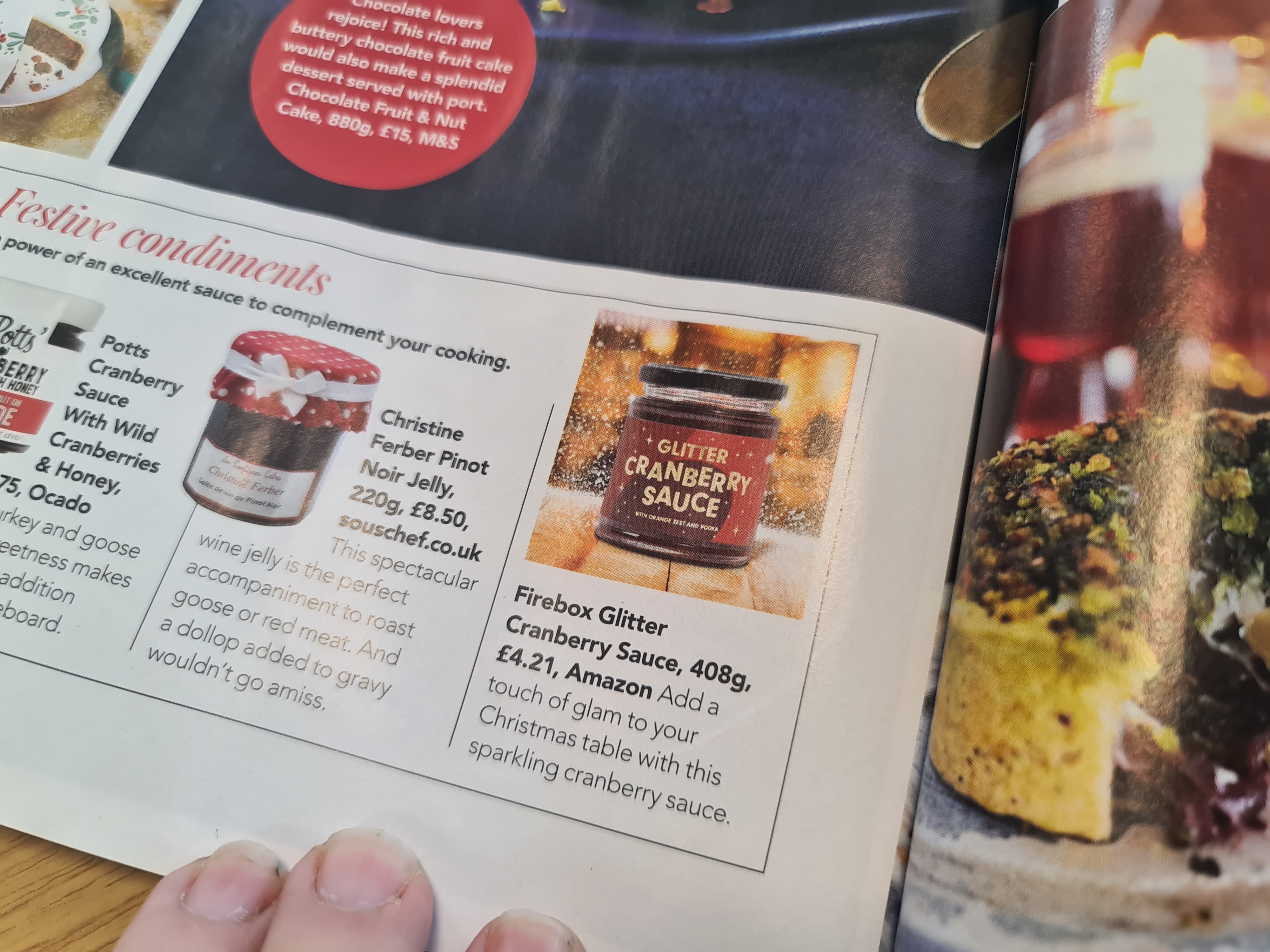 There are recipes for food, drinks and baking, of course (see the Gingerbread House cake up above: something similar will be happening at my house this year) and also pages of suggestions for foodie presents, extras and trimmings to buy. I don’t know what my family would make if I did get hold of Firebox Glitter Cranberry Sauce, sadly not yet available on Amazon. I’m wondering if it’s worth cheating and adding edible glitter to our usual, supermarket own-brand cranberry instead?