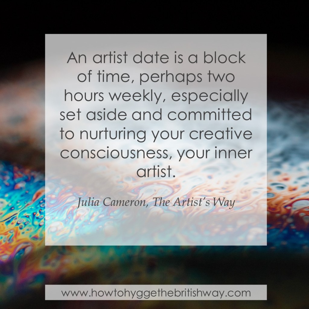 How to Set up a Year of Artist Dates by Christina Chang on The Art of Education. Very literally art-based, this article has ideas for creative artist dates, some of which are adaptable. Her reasoning behind why we need these dates is good and clear, though, and you may need to remind yourself that two hours a week to feed your inner soul is not a lot.