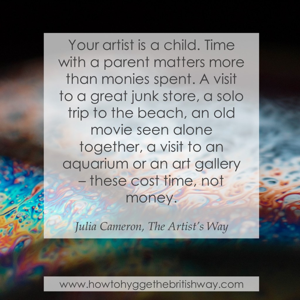Well, play has never had to cost money really. The function of an artist date is to give you space to be alone: if you can manage that in your own home, then there’s really no need to go further. If you have a computer and a room to sit in, then the world is open to you. Julia Cameron herself says that the value of the date lies not in the cost but in the attention paid to it. You won’t be able to virtually date if you sit in the living room with the TV on, or try to squeeze in a date while cooking tea unless, of course, the preparation of tea becomes the date.