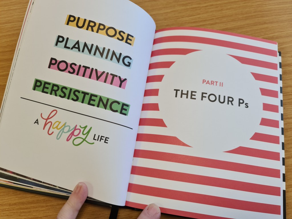 The book is broken into four parts: Defining Happy; The Four Ps; Nurturing Happiness; and Living Happy. Each part is subdivided into chapters, and each chapter has a focus on something that will help you be happier, such as delineating what exactly makes you happy, the building blocks of a happy and healthy life, how to identify your purpose and how to enjoy life just as it is now. It’s no use planning a perfect future, if you can’t find something to be happy with now.