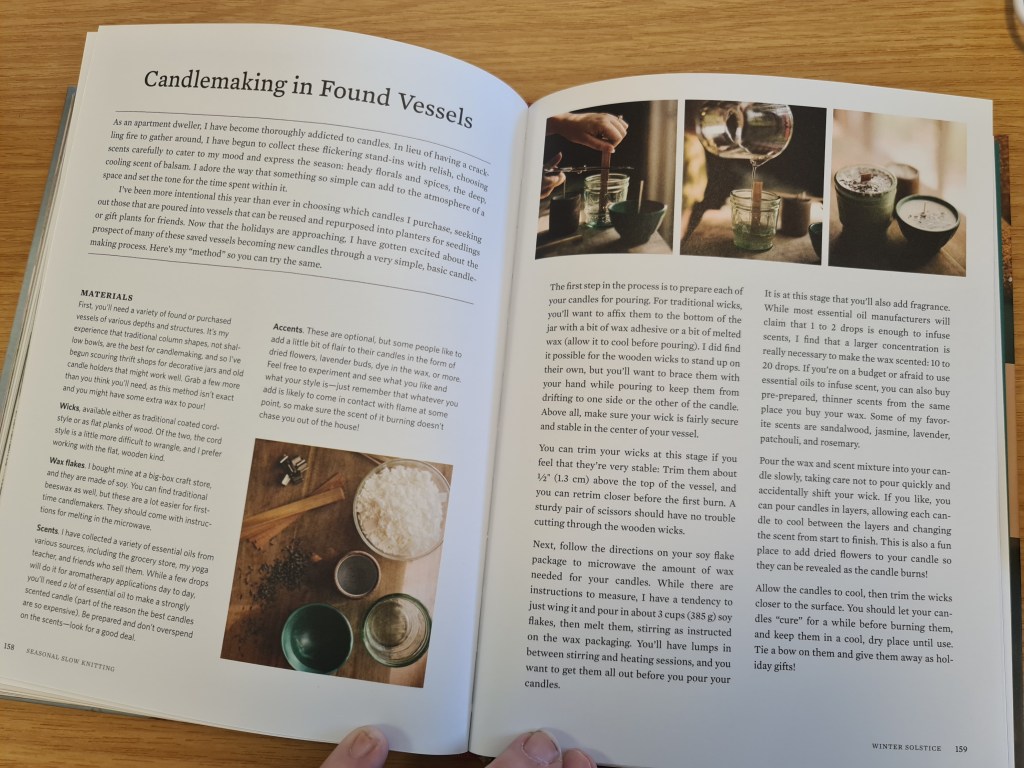 It’s the pulling out of threads to encourage us to build a slow life in and around the knitting that I like. There is so much in this book that reminds me of Heather Bruggeman at Northridge Farm, the idea of living in harmony with the seasons, of changing life subtly to suit the weather or the activities at that time. The book contains crafts that aren’t knitting as well… instructions on how to make a small pouch, a circular knitting needle storage bag or candles in re-purposed containers.