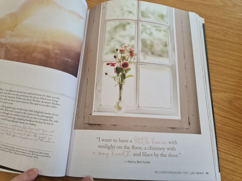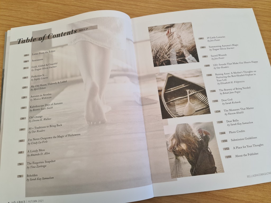 Bella Grace (subtitle: Life’s a Beautiful Journey) has been recommended to me for a few year’s now as a really beautiful read, a journal well-worth acquiring. Their mission statement on the back reads “We Believe: An ordinary life can be extraordinary, there is beauty in imperfection, and that magic can be found in the everyday.” That sounds perfectly ideal to me. I was so blessed last year to receive the Cosy Issue and I got it out again this Autumn to read through and recapture the feelings of cosy safeness that I needed. This edition (issue 29) is like that, but less overtly about hygge.