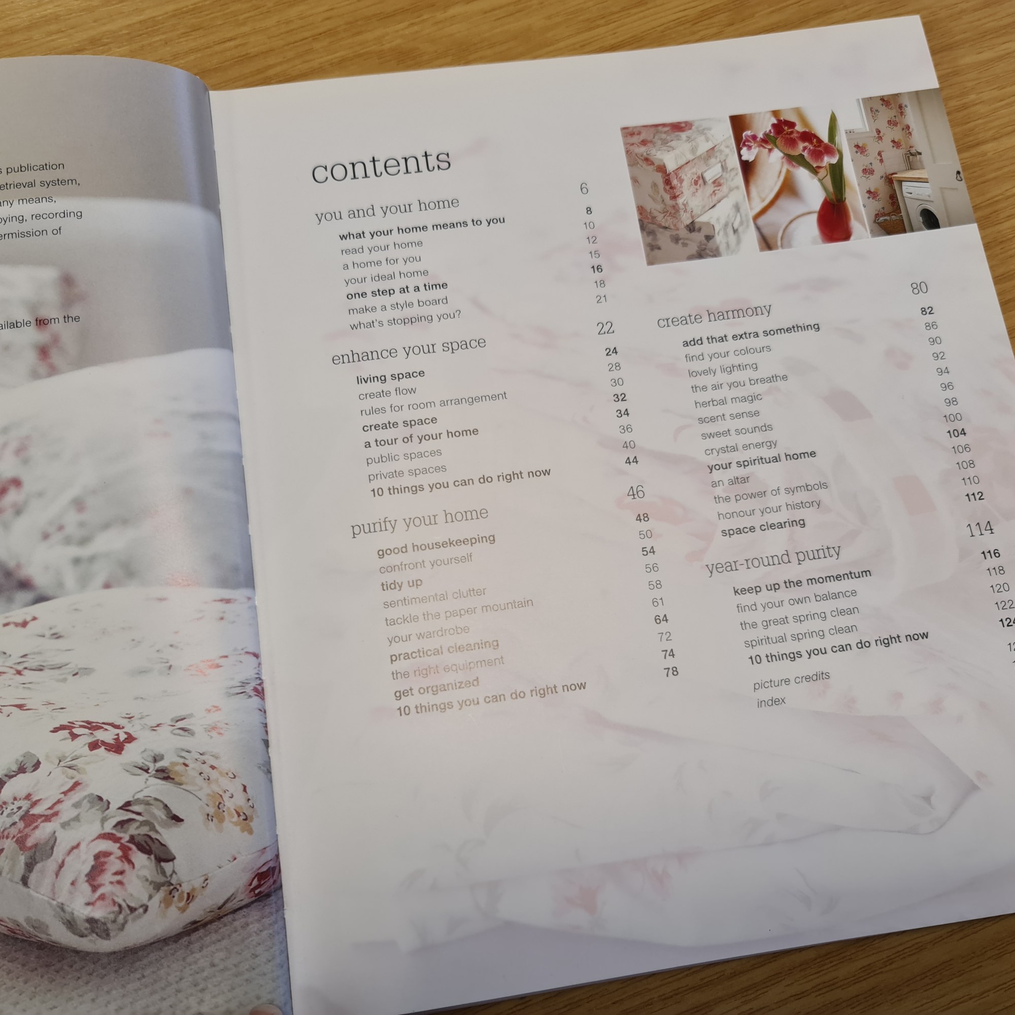 It’s divided into five parts: You and Your Home, Enhance Your Space, Purify Your Home, Create Harmony and Year Round Purity. The sections cover essentially what you home means to you, and ways that you can boost the atmosphere of your home to increase its calm, peaceful, soothing feeling.