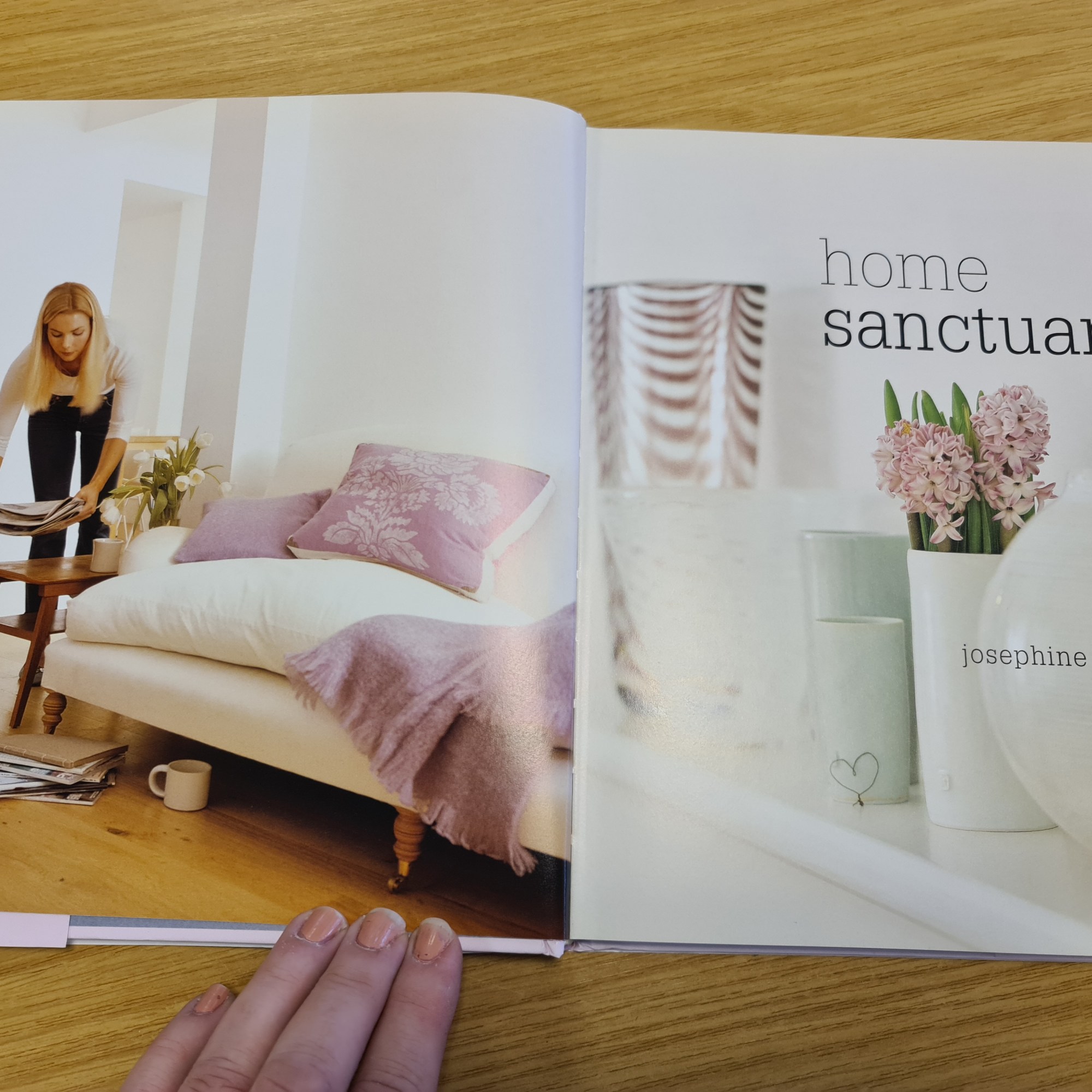 Today’s book is a good one to read today: Home Sanctuary by Josephine Collins is about creating space that supports, soothes and calms us. It’s a hardback, 11 inches by 9, with lovely full colour semi-gloss pictures throughout. The book has a very neutral, calm, white and pink aesthetic, with lots of white-painted homes and rooms.