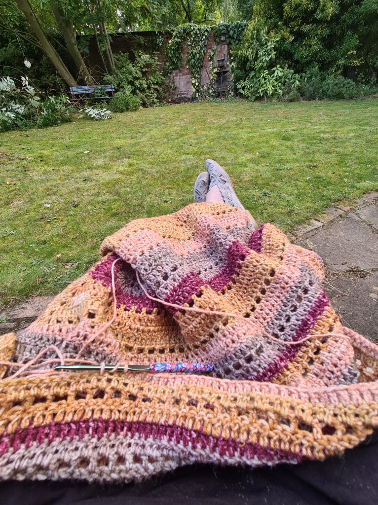 I reaped the benefit with nearly an hour of peaceful crocheting and listening to Hagitude on Audible. I’m making a real Old Witch shawl for the winter: large, warm and solid rather than lacy. This is about half way through, so it really will wrap twice around me when I’m done. I had a cake of Stylecraft Batik Winter Wonderland left over after making a poncho earlier this year, so I’m using that along with another one I’ve bought. The pattern is from a site called Sewrella and is named The Wishing Well Crochet Wrap. It’s a lovely and quick make, with three rows of treble stitch and then a row of holes. Really useful meditative crochet.