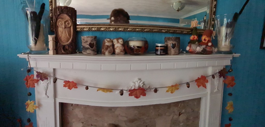 Today, I decorated for Autumn. Fabric leaves, conkers and acorns, candles in soothing, soft scents like cashmere and sandalwood and the colours of Autumn all round. Bliss.