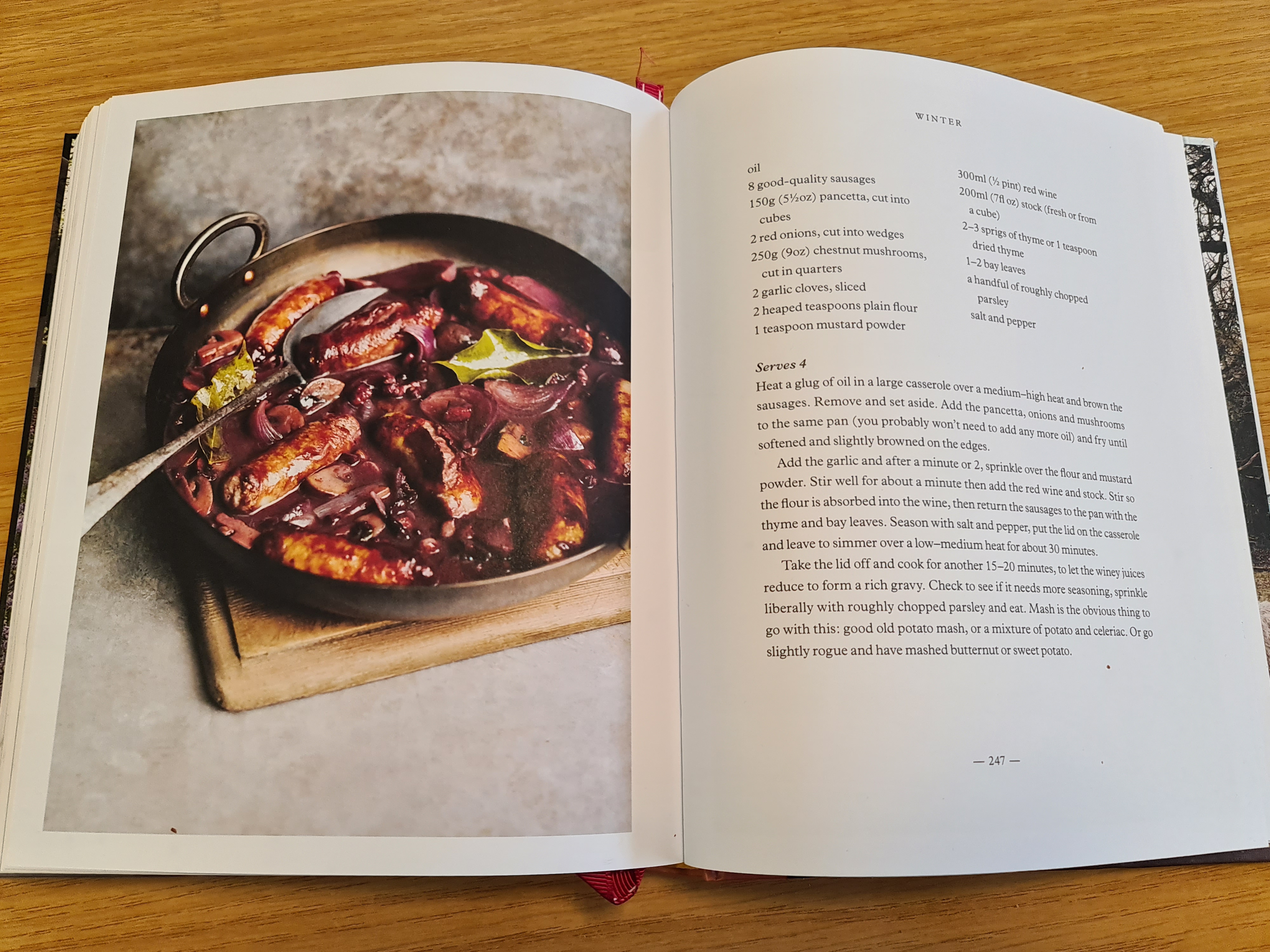 I have consciously added several of her recipes to my repertoire, though. Last weekend we had the Sausages in Red Wine recipe, complete with mash and bashed swede and carrot. It was delicious, easy and made excellent gravy. I’ve tried the Chocolate and Marmalade Loaf as well, which is available as a recipe online, and I am making soda bread more regularly as a result of the seasonal recipes within.