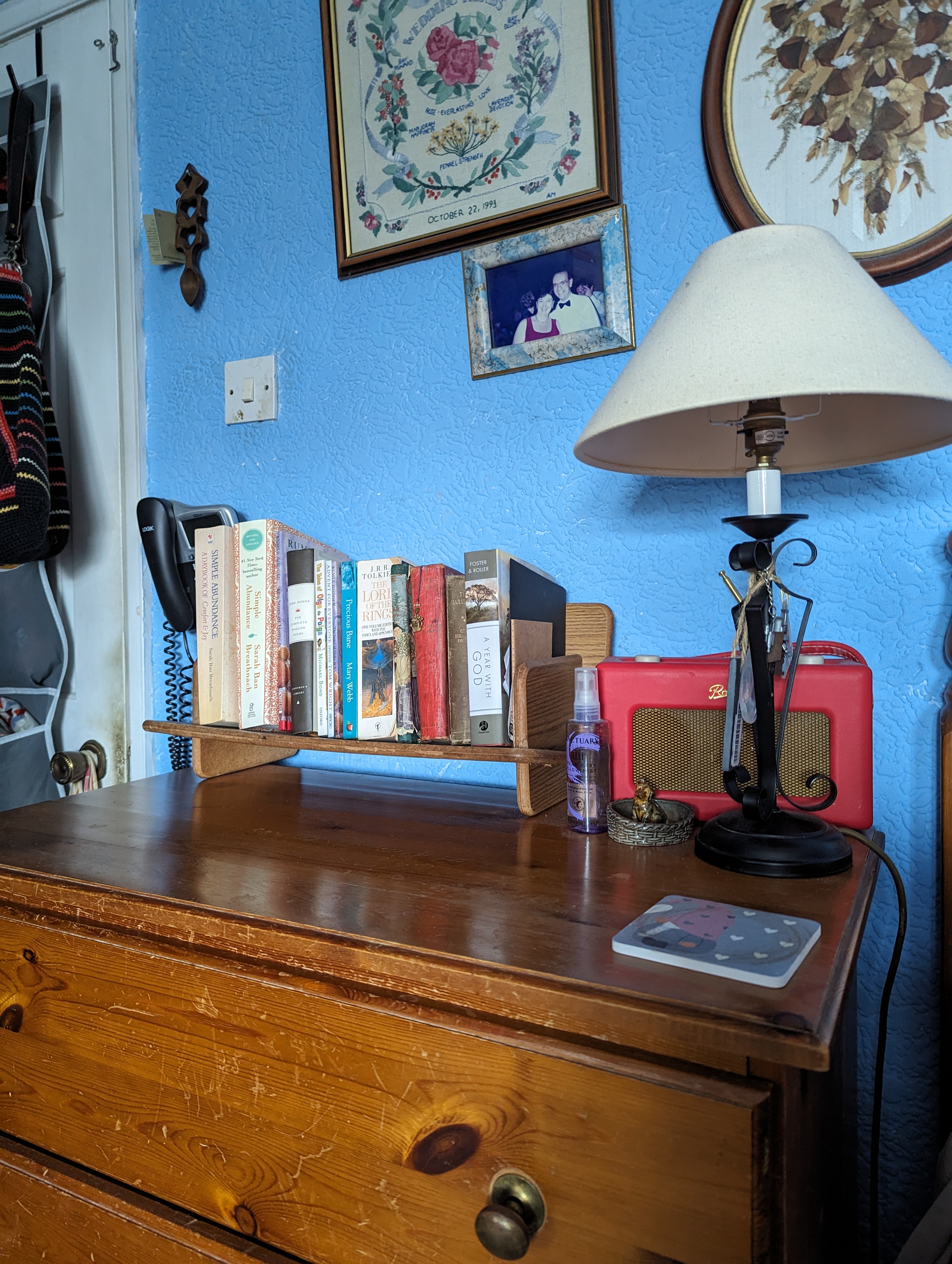 My evening space is in a state of recreation. I polished my bedside table with proper beeswax polish last week and I have just not put anything there yet, not my little rocks, no mat, no models or icons, quotes, cards or anything other than a shelf with the most meaningful books I own. These are the books that have been with me throughout my adult life: a copy of Jane Eyre off my Grandmother, my mother’s ex-library copy of The Harvester, my personal copy of The Lord of the Rings and (of course) both versions of Simple Abundance. I’m keeping the space clear for the moment, and seeing what (if anything) I want to put there as a focus or whether the wood, the space, the symbolism works better for thinking. My evening reading is mostly novels or the current non-fiction I’m working through, but read on my tablet or Kindle rather than hard copy. It may stay clear or I may find the small picture gifted me on my Holy Communion, the rocks from holidays that remind me of family and love, or create a new focal area with found gifts from Nature, snapped up trinkets from travels or gifted memories and inherited treasures.