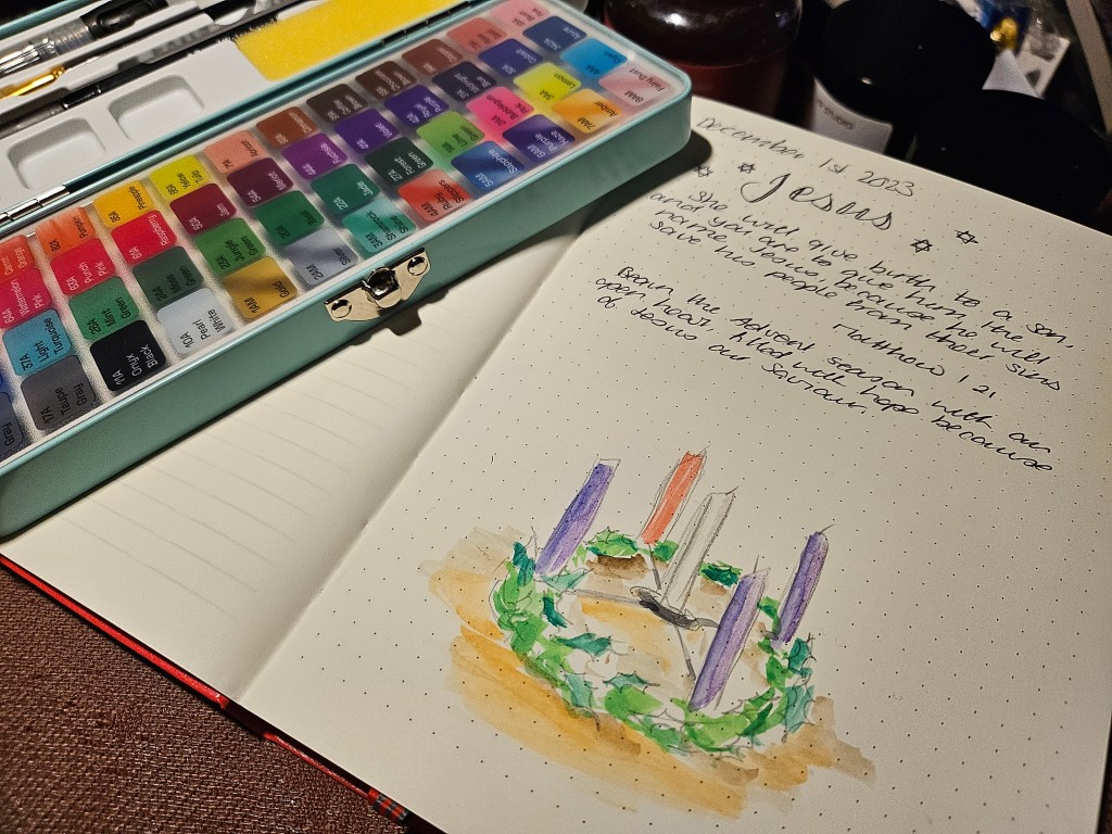 This year I’ve been keeping a Christmas Commonplace book, a weird combination of journal and space to write down the quotes, poems, lists and lore that makes Christmas my favourite time of year. I’ve been drawing in it, and using watercolour paints to add a splash of colour.