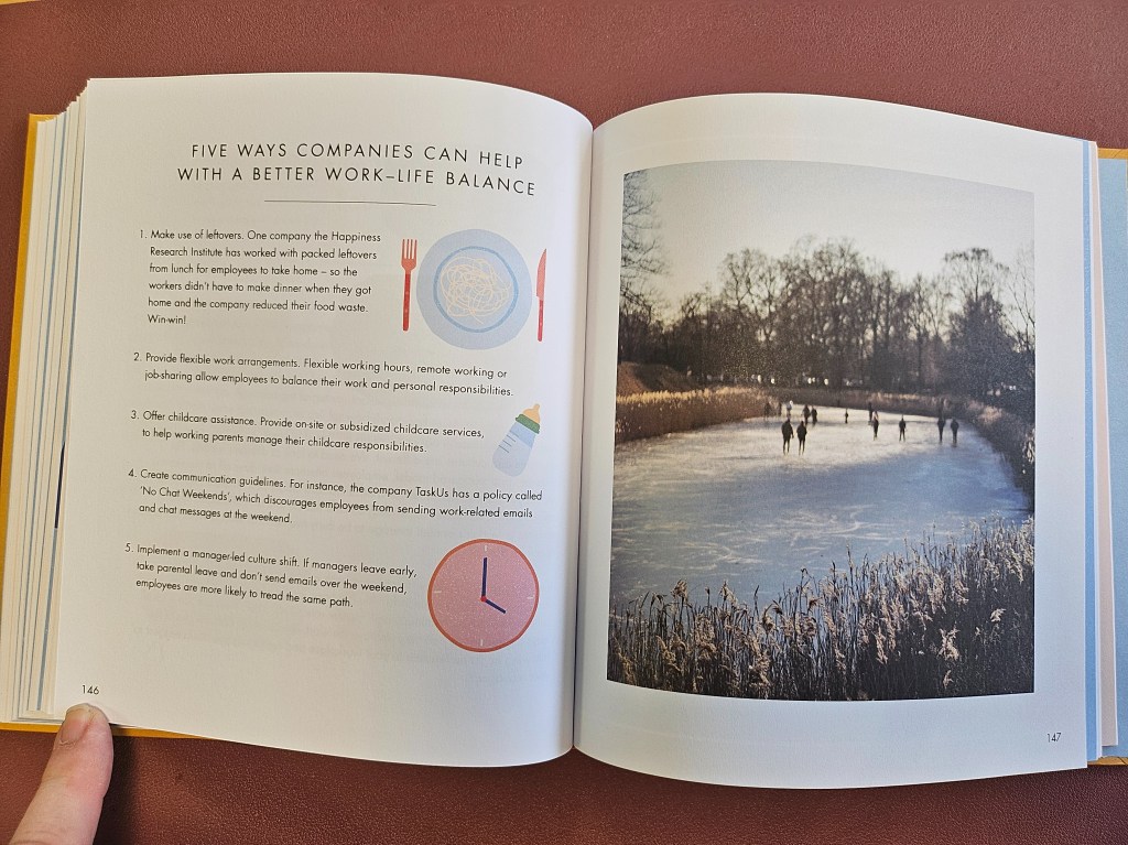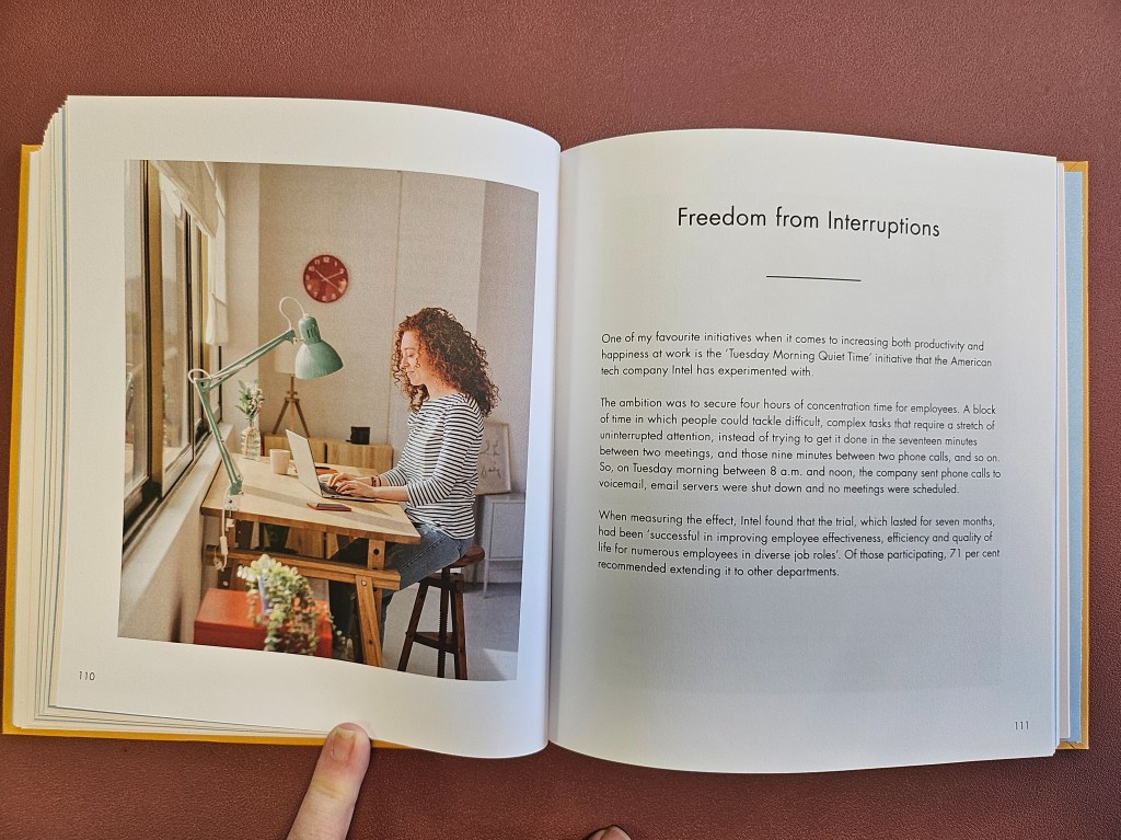 Balancing work and life is important for happiness, and throughout the book that is evident in how companies structure the day, the workflow or the location. There’s advice on disconnecting, creating no-contact times to handle emails or projects, and also how homemaking and shared chores can help reset work-life balance.