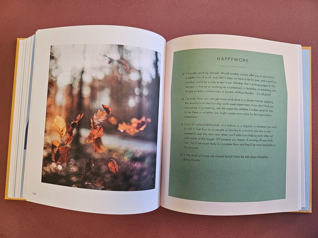 Let’s get the physical stuff out of the way. In size, paper and appearance this book sits very nicely alongside My Hygge Home on the bookshelf. It’s good quality paper, approximately 7 by 7 inches in size, and a good quality hardback. It looks cosy, the colour scheme is attractive and it makes a very acceptable gift. Yet, the book could just as easily slide into a management and workflow shelf and is designed to be read by people with a definite job or employment, paid or not.