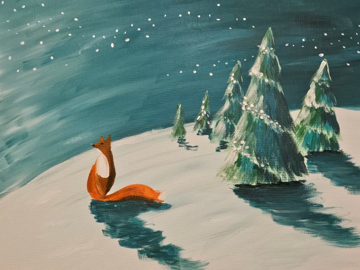 The photo between post and promotions is the completed picture from a Sip and Paint session I attended a couple of weeks ago. I love these sessions: you go with a blank canvas and usually end up with something that, left to your own devices, you might never have figured out how to do. This painting used only five colours and it was how we combined and blended them that made the difference. I’m a very unconfident painter, so this is paradise to me. Call it Fox and Snow, or perhaps The Fox of Delights in honour of one of my favourite Christmas TV programmes.