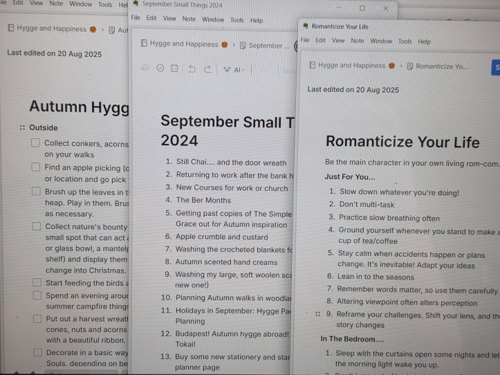 I’ll be writing my physical list in whichever planner I’m in that week, a virtual list in Evernote and a post as often as I can on Instagram, on the Facebook Page for How to Hygge The British Way and in The Hygge Nook. I’ll also aim to do a catch up post once a week or fortnightly on the blog. You’re very welcome to join me. Use the hashtags #septembersmallthings #smallthings and #gratitude and let’s spread the sunshine joy this Autumn!